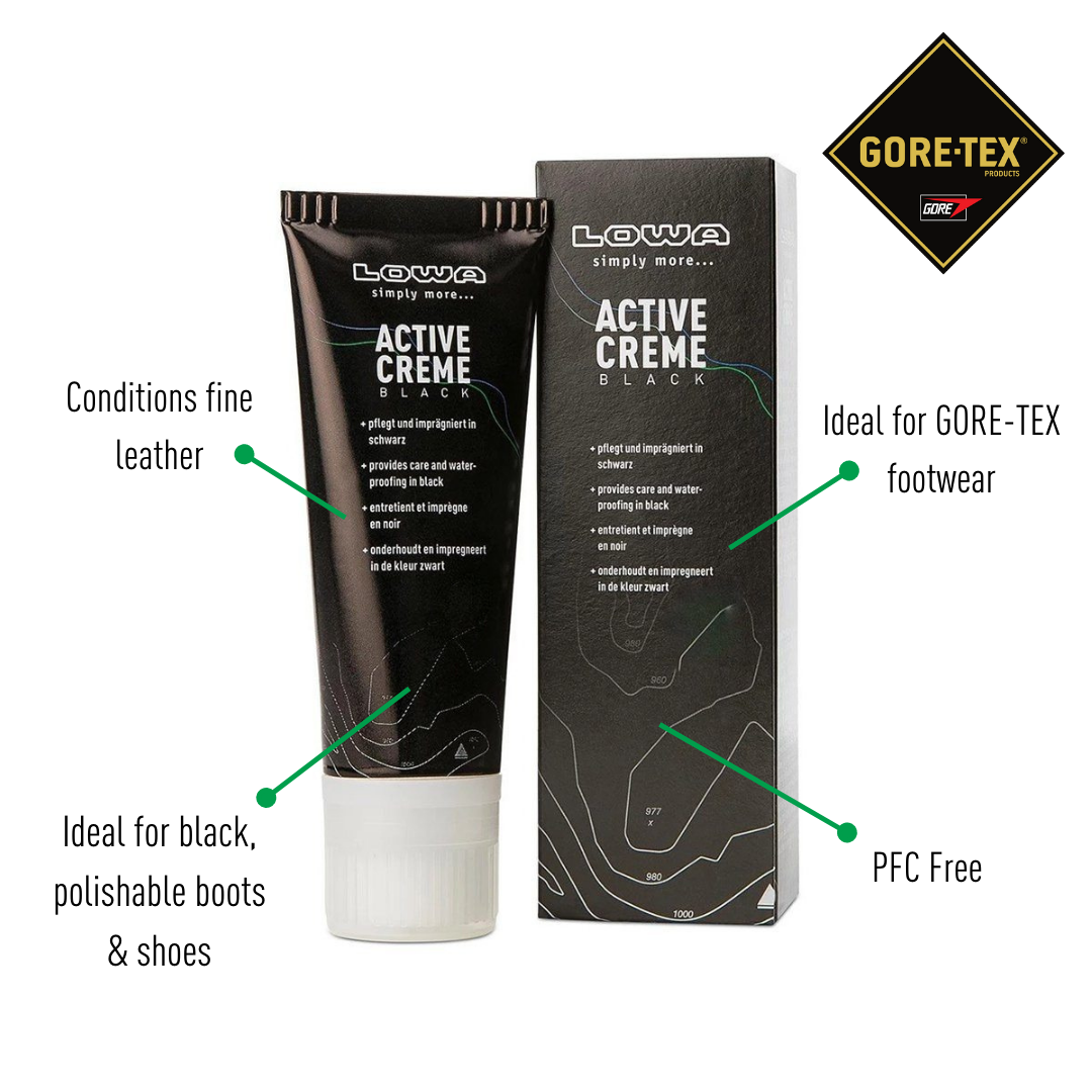 Extend the life of your boots. Lowa Active Crème Leather Conditioner is ideal for all leathers, all shoe textiles. Lowa's patented new boot care product conditions fine leathers, extending the life of your boots. Active Crème does not clog the pores of the leather and allows the leather to breathe, which in turn creates a more comfortable climate for your feet."